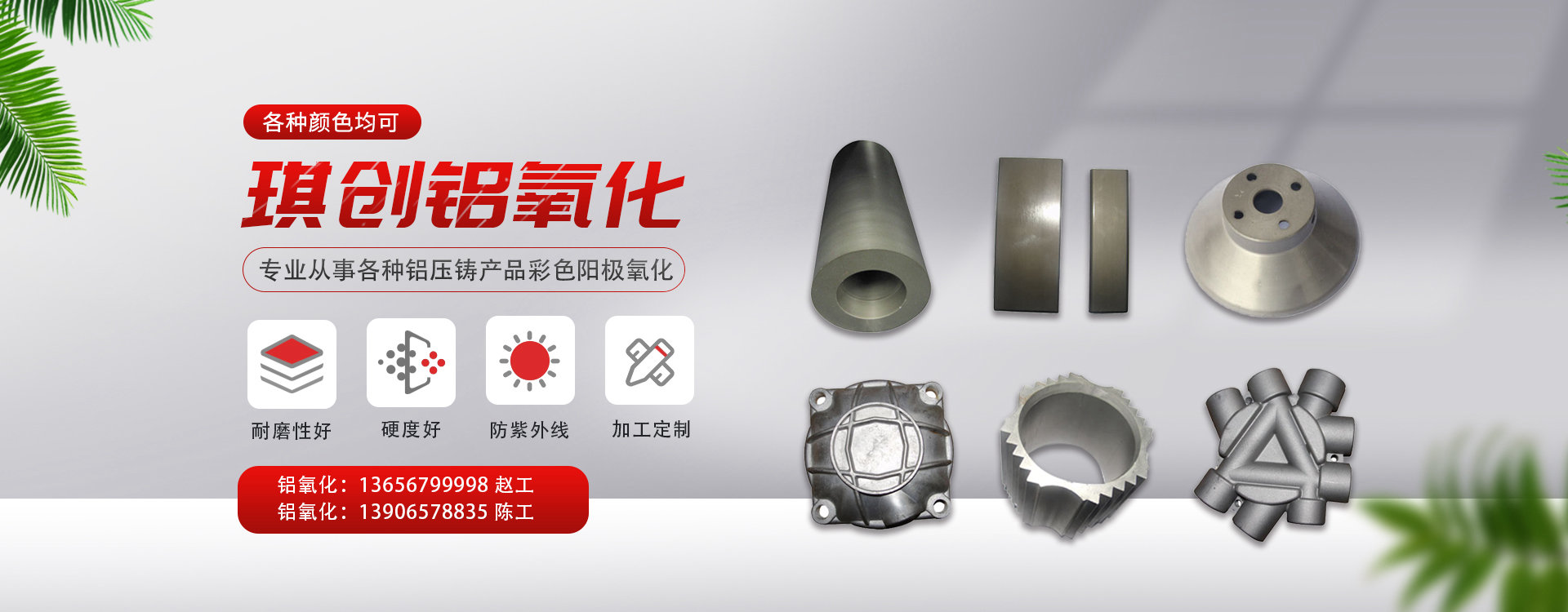 專(zhuān)業(yè)從事各種鋁壓鑄產(chǎn)品彩色陽(yáng)極氧化(各種顏色均可)。以及鋁制品表面處理,加工,項(xiàng)目有各型號(hào)鋁硬質(zhì)氧化,普通陽(yáng)極氧化,電解著色、電解拋光,各種著色染色處理。本廠(chǎng)在壓鑄鋁,微弧氧化,低壓澆鑄鋁,重力澆鑄鋁鍛打鋁等硬質(zhì)氧化,普通陽(yáng)極氧化工藝技術(shù)